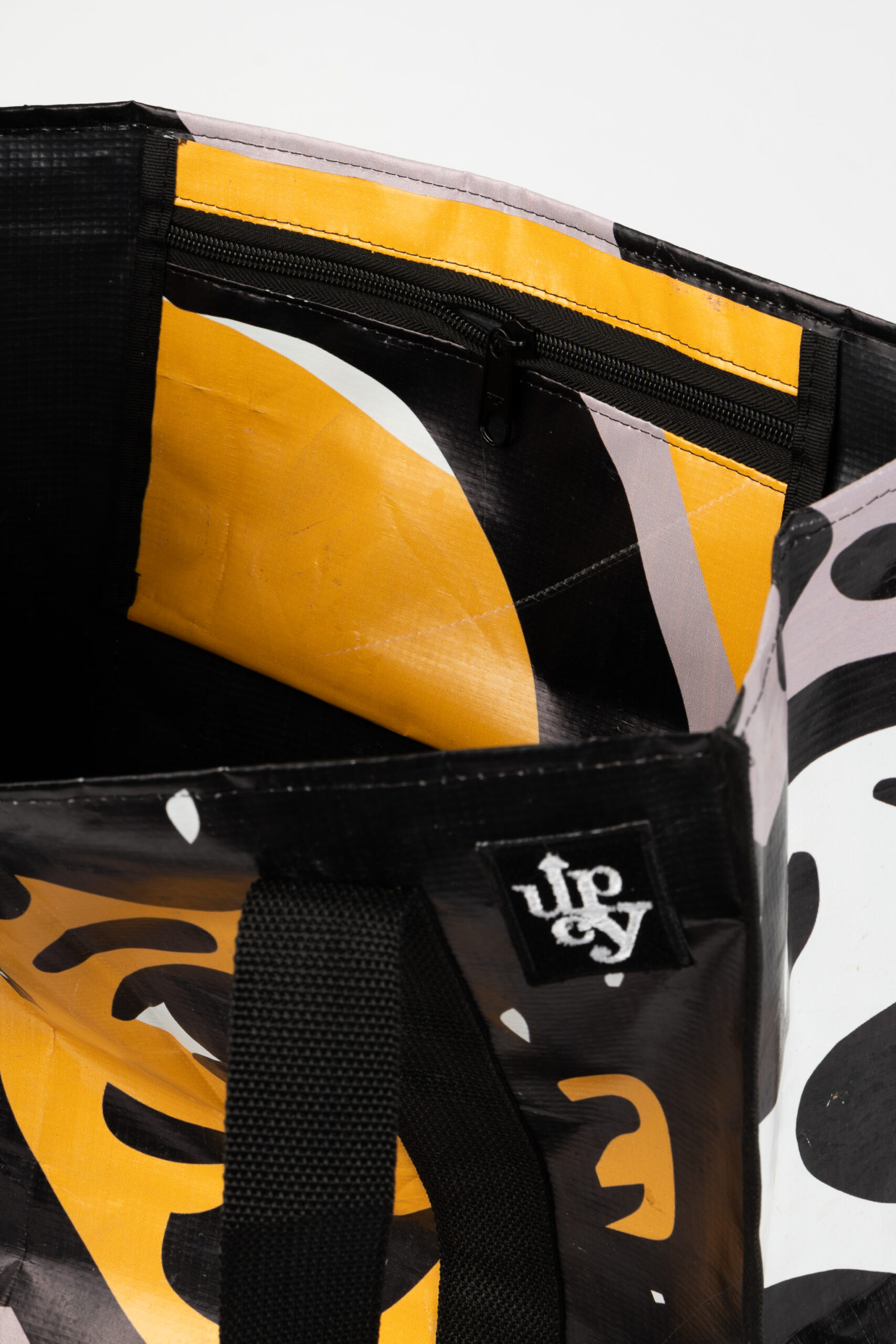Todos os produtos UPCY são criados artesanalmente a partir do reúso de lonas vinílicas utilizadas em eventos e propagandas. A lona é um material composto por PVC (policloreto de vinila), resina e aditivos. Existem lonas de diversas gramaturas (280g, 320g e 440g) a depender a quantidade de PVC. Em seu verso é possível encontrar uma tela de fios que forma um tecido fundido ao PVC. Esse tecido é chamado de trama. Quanto maior for a trama de fios, maior resistência da lona. Existem tramas de 250×250, 500×500 e 1000×1000. A durabilidade da lona depende, portanto, da sua gramatura, trama e uso. Não garantimos gramatura e trama das lonas dos produtos Upcy. A depender do uso do produto é comum as tramas da lona ficarem expostas, o que não configura defeito ou vício do produto. Também não garantimos o layout da peça, ou seja, cada peça é feita com as lonas disponíveis em estoque.
